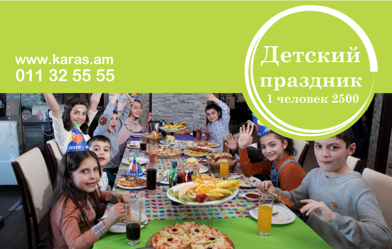 <p><strong>Карас подготовил праздничное предложение</strong><br>* Тематический дизайн<br>* Разнообразие блюд<br>* Яркое и красочное событие</p><p>Стоимость на человека 2500 драм.<br>* Это специальное предложение доступно в торговом центре Карас Ереван Молл.</p><p>В коплект входит:<br>2 большие пиццы (Палермо и Чик Марли)<br>5 кусочков курицы на палочках<br>1 порция салата Карас<br>1 порция бабушкин салата<br>5 порций картофеля фри<br>1 порция хлеба<br>5 бутылок кока-колы / фэнтези или компота</p><p>Мы также подготовили ПОДАРОК. Мы предоставим подарочную карту на 5000 драм для каждого пятого ребенка. Для регистрации и других деталей, пожалуйста, звоните 091 244 248.</p>
