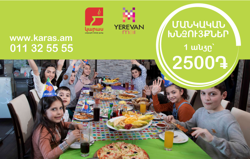 <p><strong>Շահավետ առաջարկ՝ մեծերին, անմոռանալի օր՝ փոքրերին:</strong></p><p>&nbsp;Կարասը պատրաստել է մանկական խնջույքի փաթեթ-առաջարկ՝<br>*&nbsp;թեմատիկ ձևավորում<br>* ուտեստների մեծ տեսականի&nbsp;<br>* վառ ու գունեղ միջոցառում</p><p>&nbsp;ԵՎ ինչ խնջույք առանց ՆՎԵՐ. Նավապետ Քիդի 5000 դր արժողությամբ նվեր քարտ` ամեն 5 փոքրիկ այցելուի համար:</p><p>Իսկ մեկ անձի արժեքը ԸՆԴԱՄԵՆԸ` 2500դր:<br>* Ակցիան գործում է Երևան Մոլի Կարաս մ/ճ-ում:<br>Խնջույքի փաթեթի մեջ ներառված է՝<br>2 հատ մեծ պիցցա (Պալերմո և Չիքն Մառլեյ)<br>5 բաժին հավի իքիբիր փայտիկների վրա<br>1 բաժին Կարաս աղցան<br>1 բաժին Տատիկի աղցան<br>5 բաժին ֆրի<br>1 բաժին հաց<br>5 շիշ Կոլա / Ֆանտա կամ տնական կոմպոտի տեսականի<br><br>Մենք նաև պատրաստել ենք ՆՎԵՐ. ամեն 5 երեխայի համար կտրամադրենք 5000 դրամ արժողությամբ նվեր քարտ Նավապետ Քիդի ատրակցիոններից և խաղերից օգտվելու համար: Ամրագրելու և այլ մանրամասների համար խնդրում ենք զանգահարել 091 244 248 հեռախոսահամարին:</p>