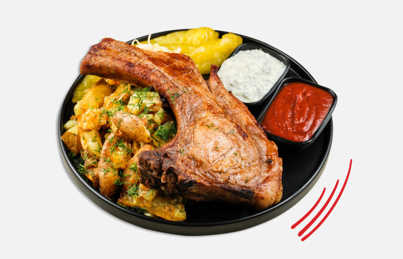 Served with mashed potatoes, pickles and sauces.